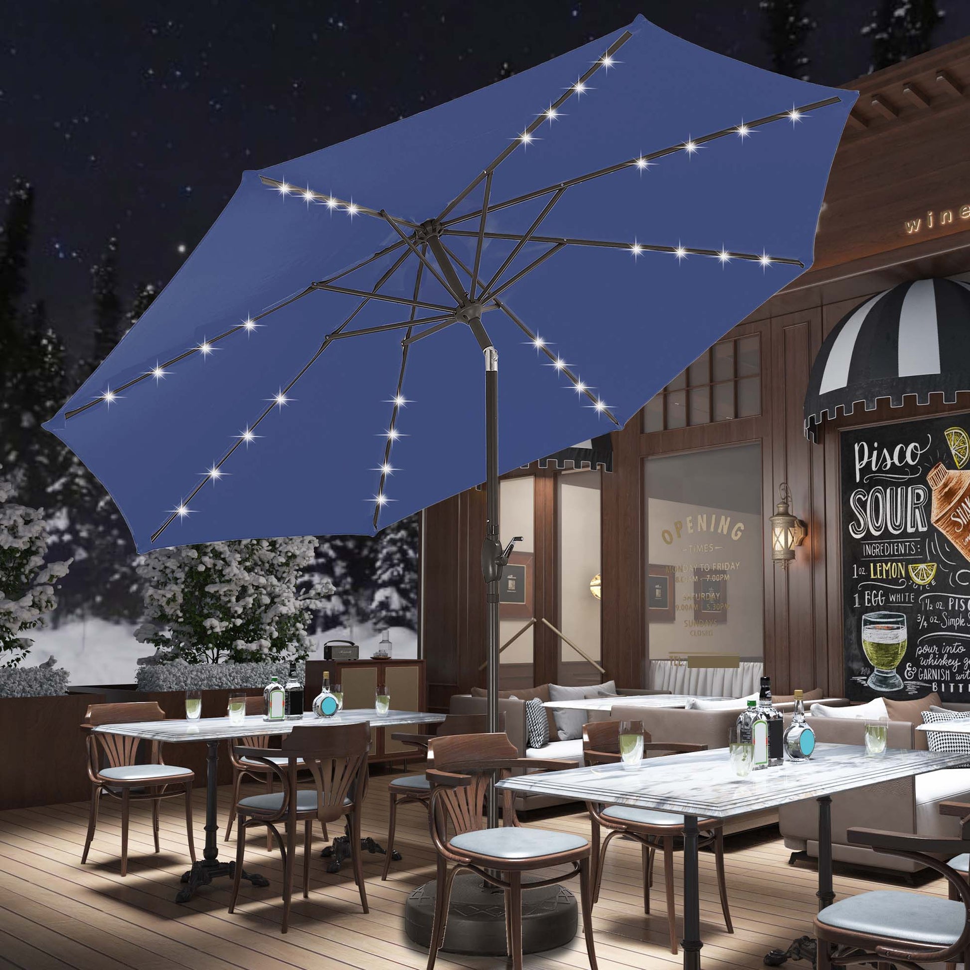 Autlaycil 10 ft Solar Patio Umbrellas and Base, with 32 Lights for Market Outdoor Pool, Steel Tilt Crank-Navy Blue