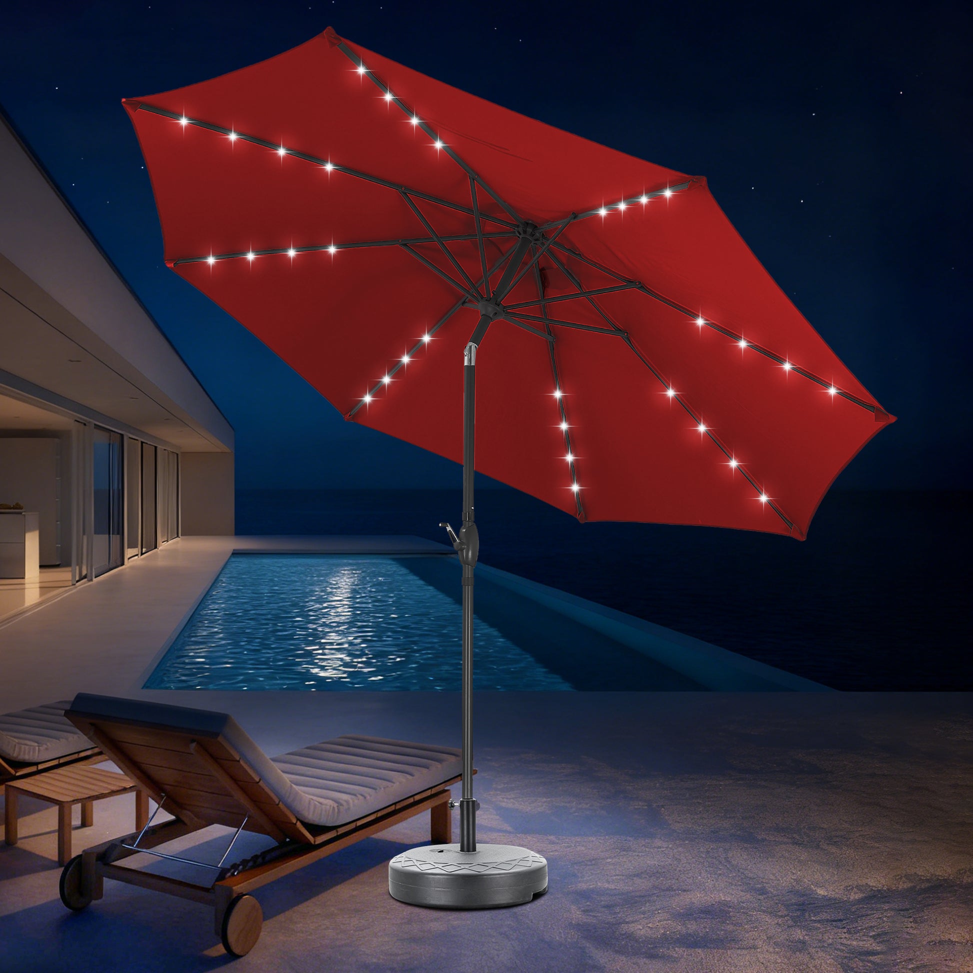 Autlaycil 10 ft Solar Patio Umbrellas and Base, with 32 Lights for Market Outdoor Pool, Steel Tilt Crank-Red