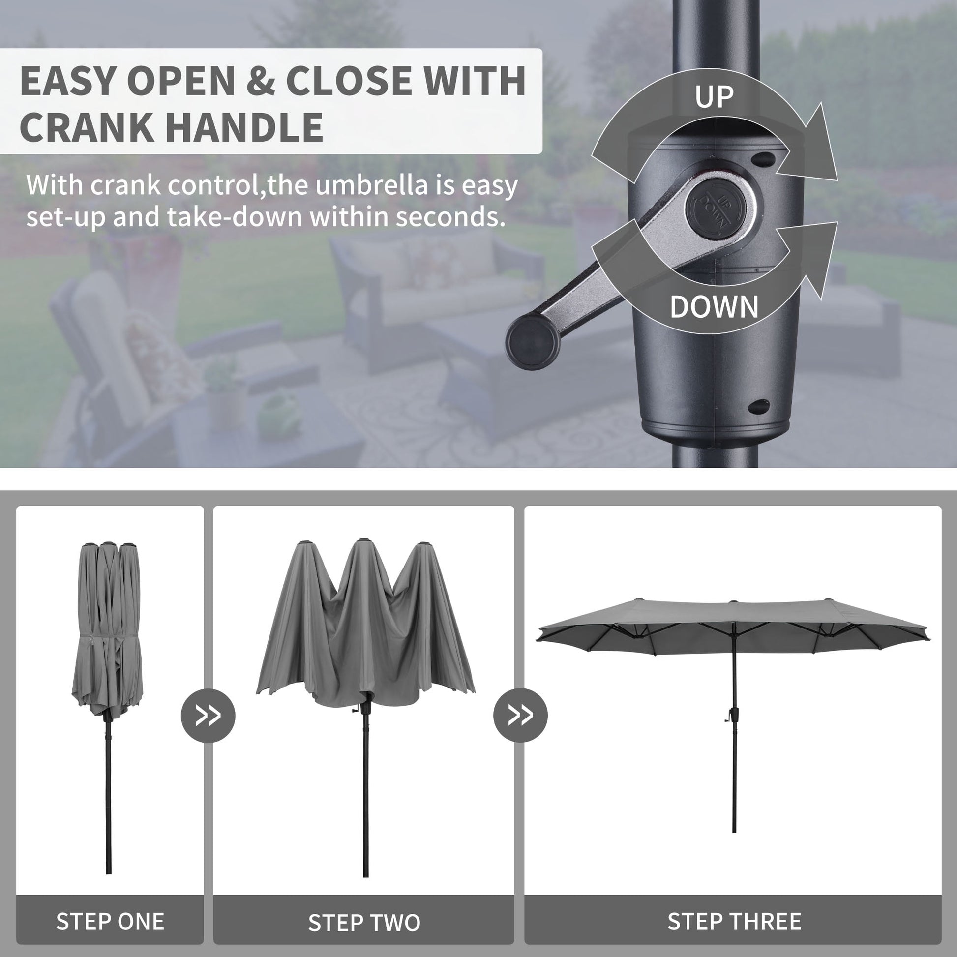 Easy Crank Mechanism - The manual crank mechanism located on the outdoor patio umbrella pole is easy to control for smooth opening and adjustment.
