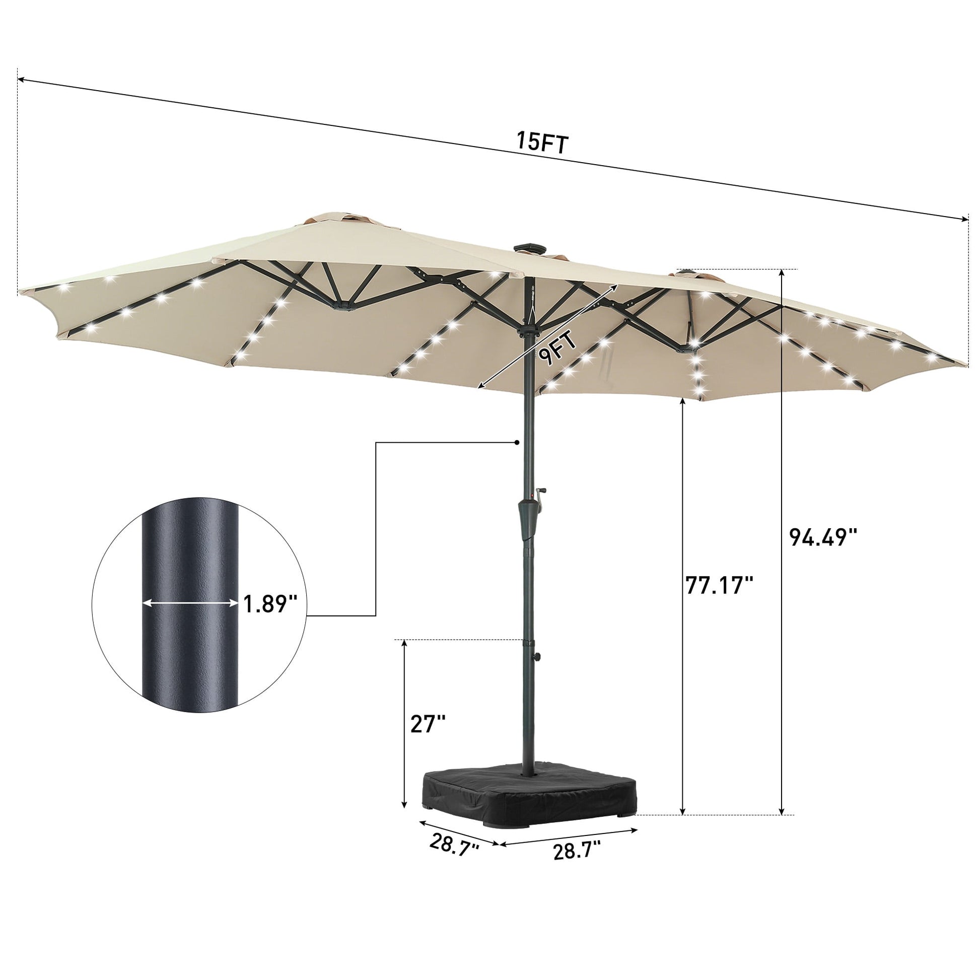 This patio double-side umbrella has 4 LED bulbs on each rib and totally has 48 LED bulbs. It provides energy-efficient lighting, so that you can have fun with your family at night.