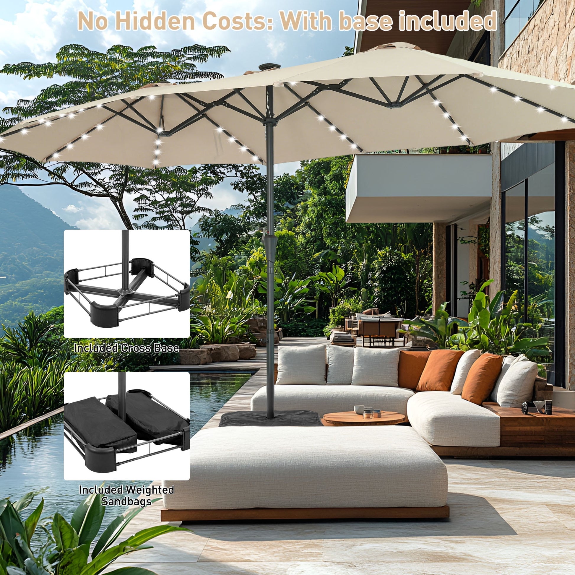 Autlaycil 15ft Large Rectangle Outdoor Patio Umbrella and 48 Solar Lights with Matching Base, Market, Beach, Garden, Yard, Party, Khaki