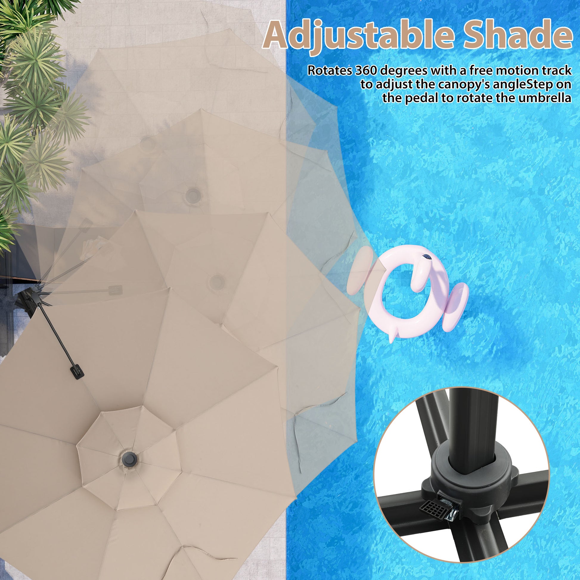 The umbrella features a free-rotation track design that allows 360¡ã adjustment of the canopy with just a foot pedal, enabling you to easily change shading directions without moving the entire stand.
