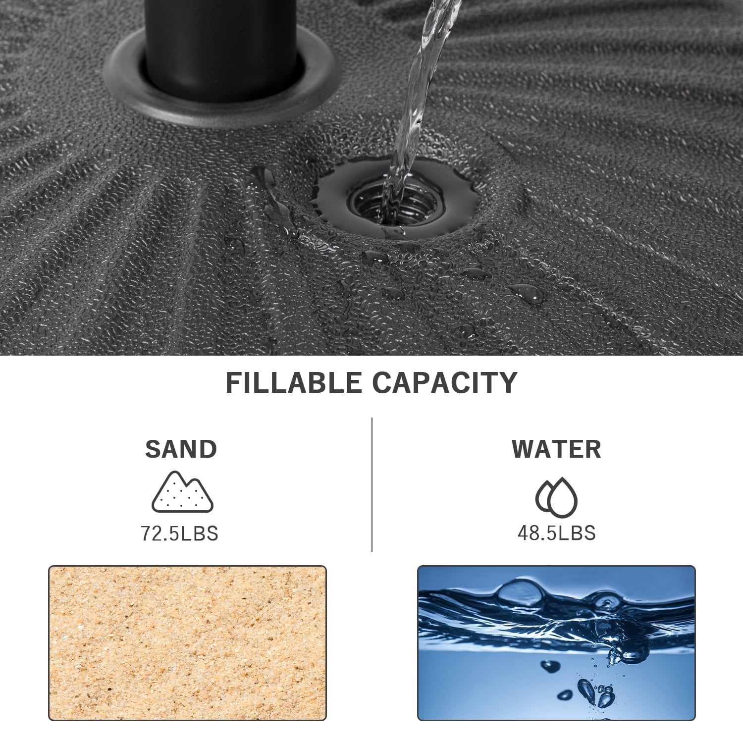Keep your patio umbrella secure stable with this Autlaycil 48 lbs water filled umbrella base.This base is easy to assemble and can hold your umbrella securely and evenly in your garden, patio, or other places.And our patio umbrella base is made of rust free resin,which have durable quality, stable and durable.In addition, our water-filled umbrella stand can weigh up to 48 lbs when filled with water; it can weigh up to 73 lbs when filled with sand. You can control the weight of the umbrella stand by adjusting the amount of water or sand without worrying about its stability.