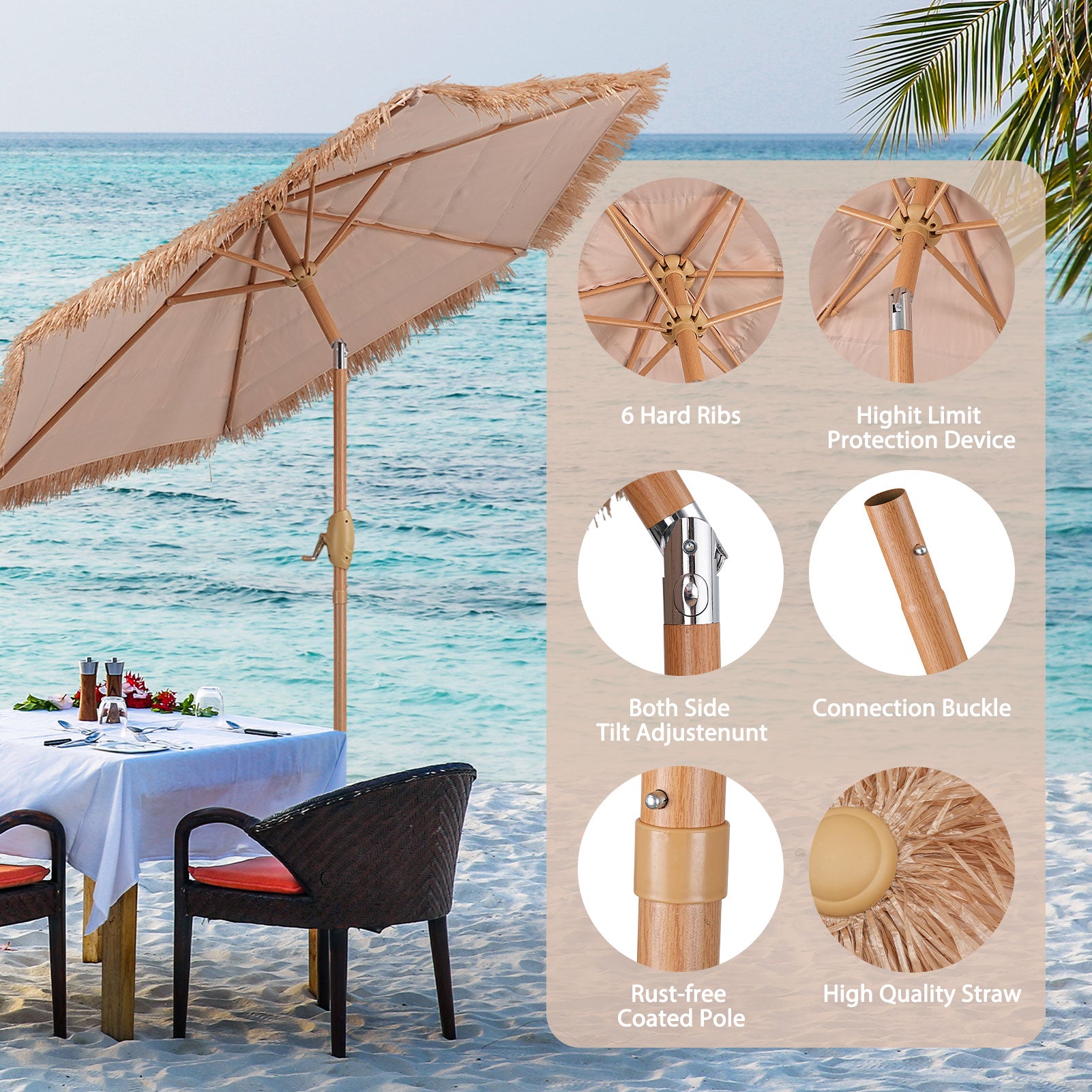 The sunshade of this hula thatched umbrella can be tilted up to 30¡ã to the left or right, which could block the sun from different directions, providing a cool shade area all the time. And it is easy to adjust with a push button.