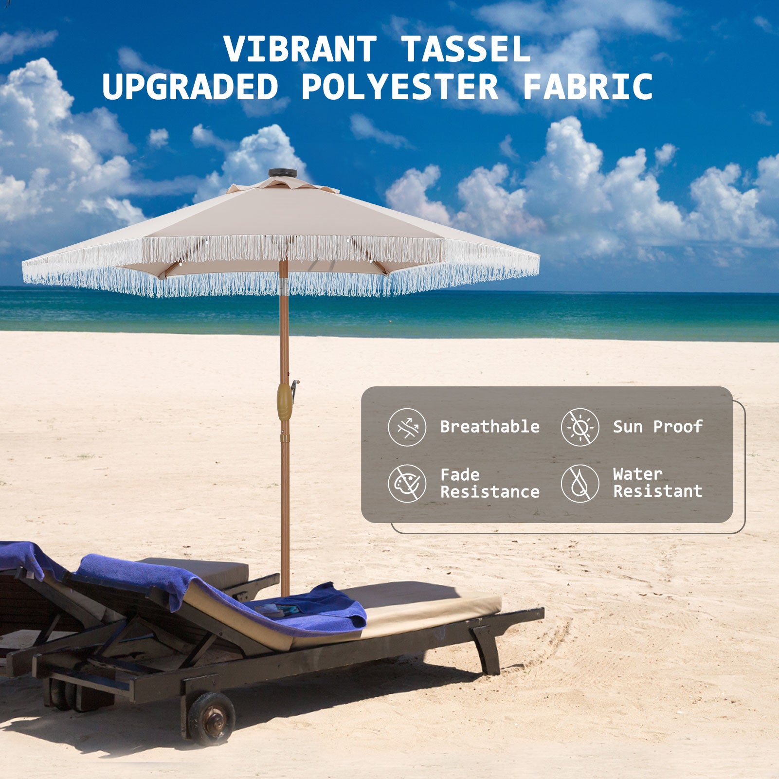 Autlaycil 7.5 ft Patio Tassel Umbrella with Base, 18 LED Lights Solar Umbrella (Khaki)