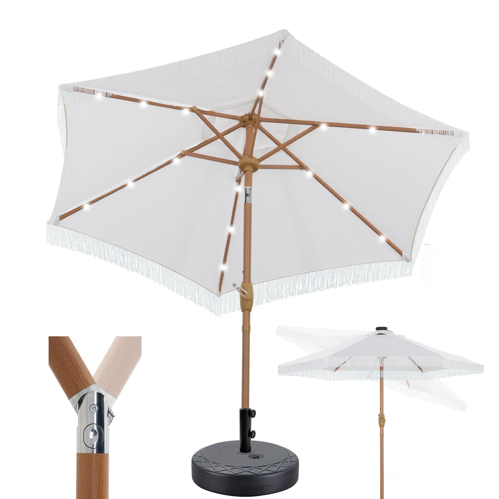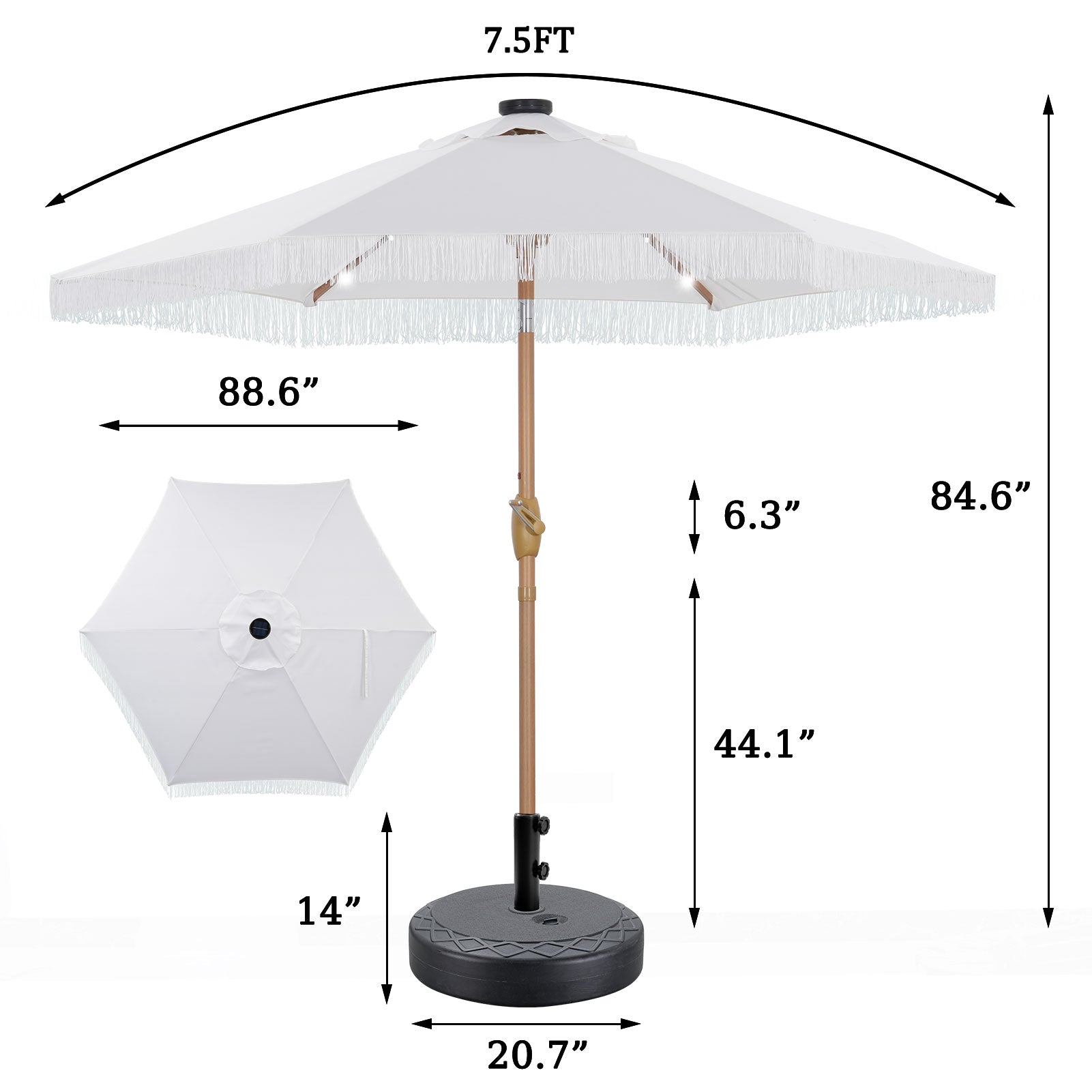 Autlaycil 7.5 ft Patio Tassel Umbrella with Base, 18 LED Lights Solar Umbrella (White)