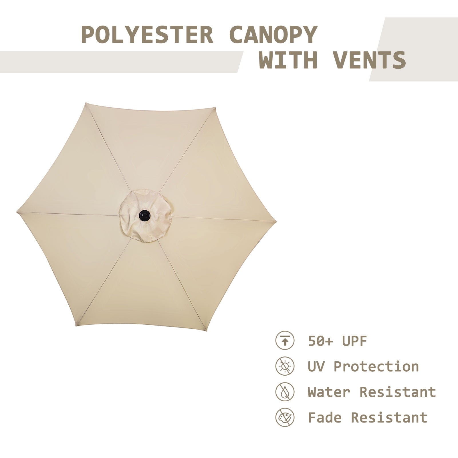 Polyester fabric features fade-resistant, water repellent, and sun protection. Protect you from the potential long-term effects of the sun and rain with our 7.5 ft Patio Umbrella.