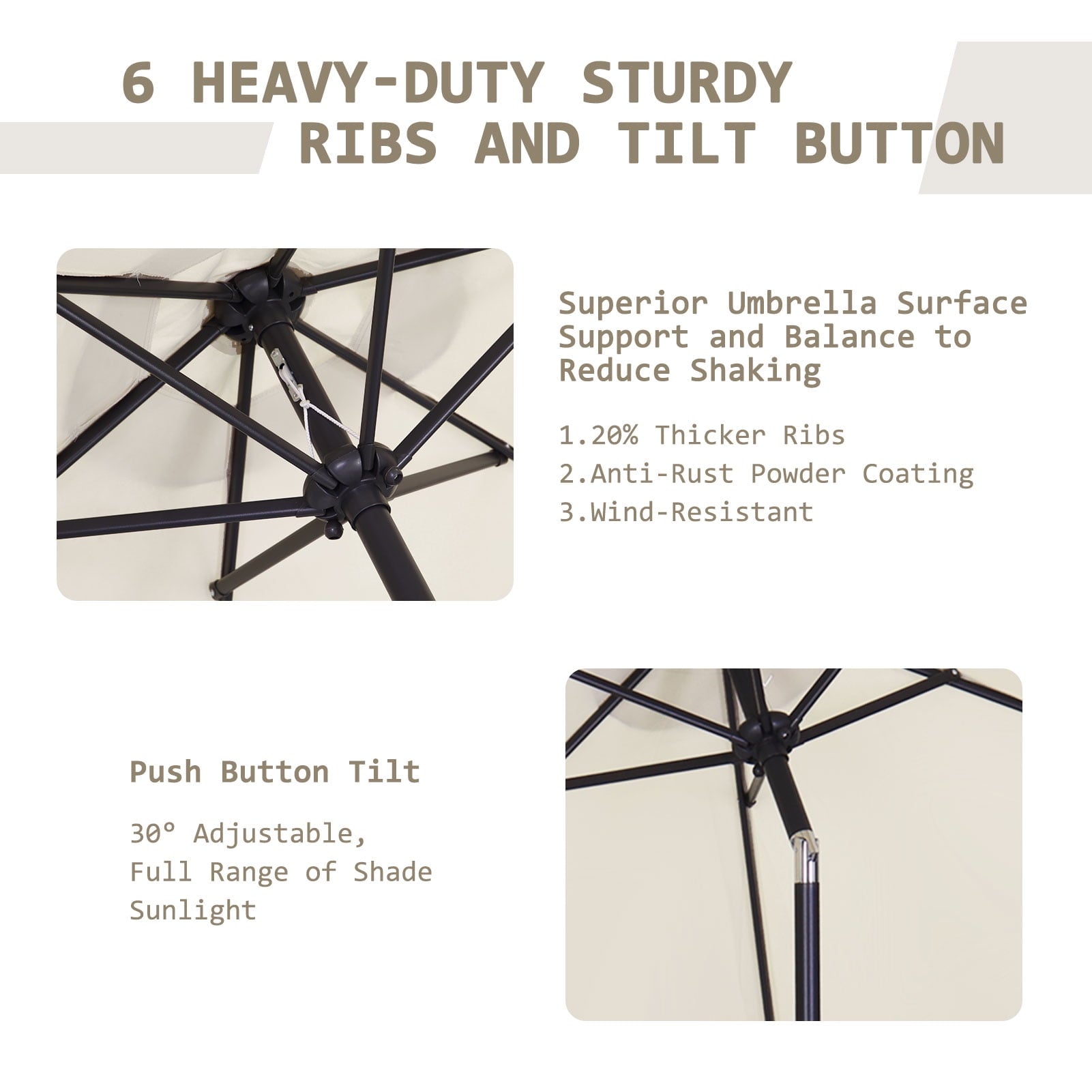 To withstand heavy wind or make it more durable in hot weather, we made it with all-iron umbrella bones and 6 sturdy ribs. Therefore, our patio umbrella can withstand repeated use.