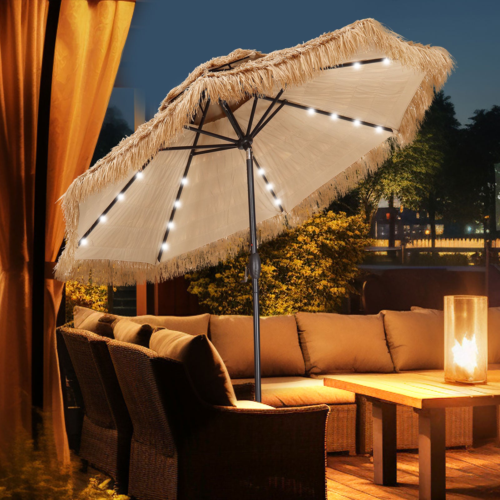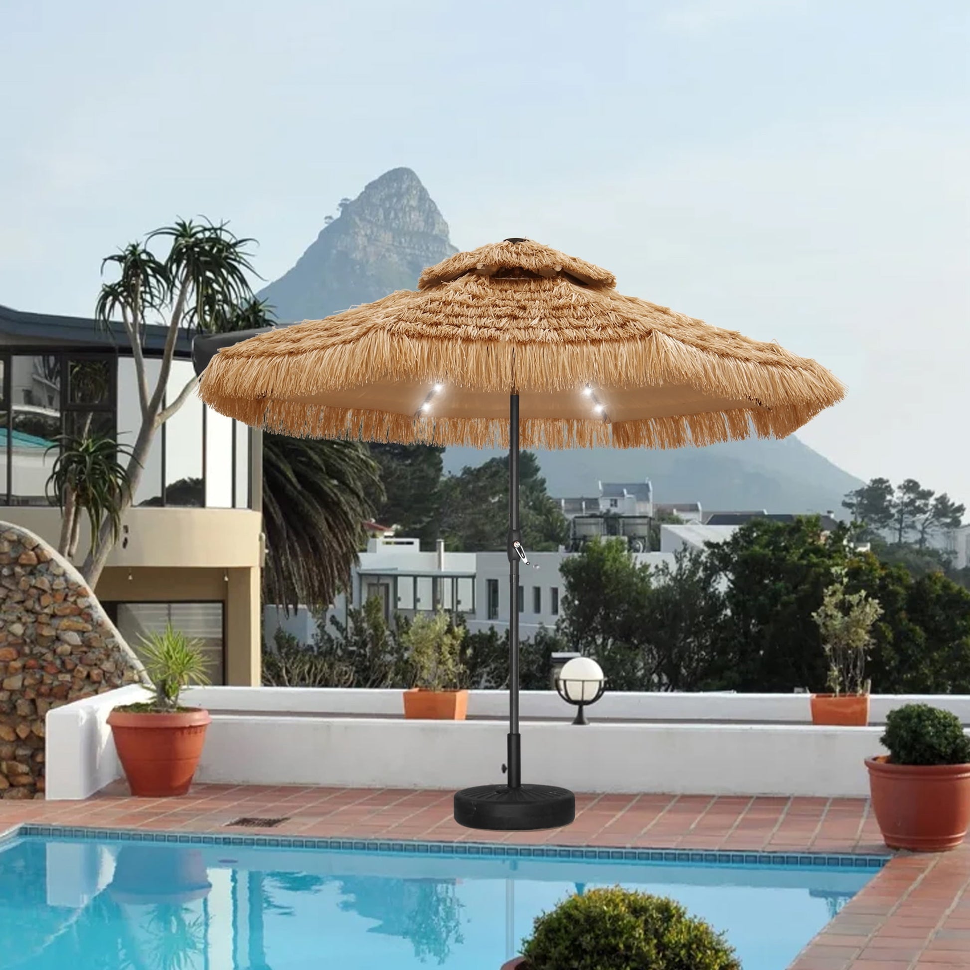 Autlaycil 9 ft 2-Tier Solar Thatched Hawaiian Tiki Umbrella, Pool, Patio, Beach