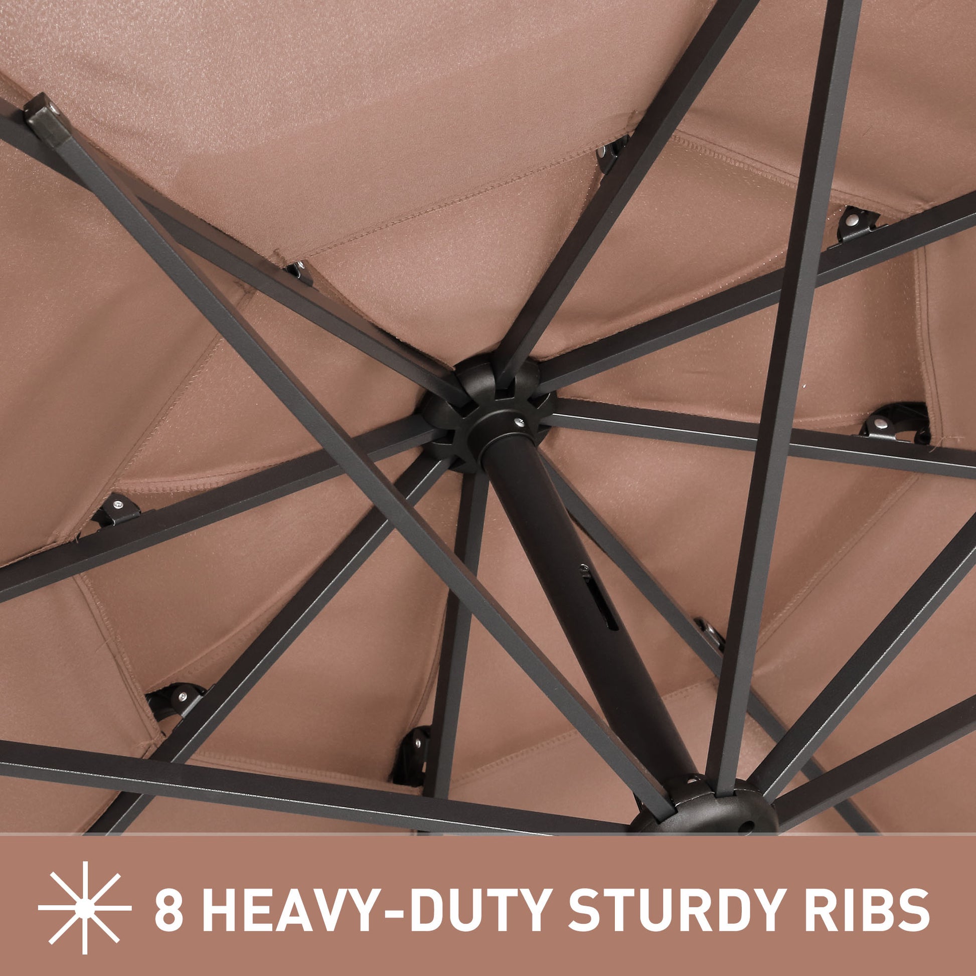 The sturdy structure of the outdoor umbrella is built with powder-coated iron poles and 8 robust ribs, offering exceptional strength and stability. With a pole diameter of 1.5"", it conveniently fits most patio table setups.