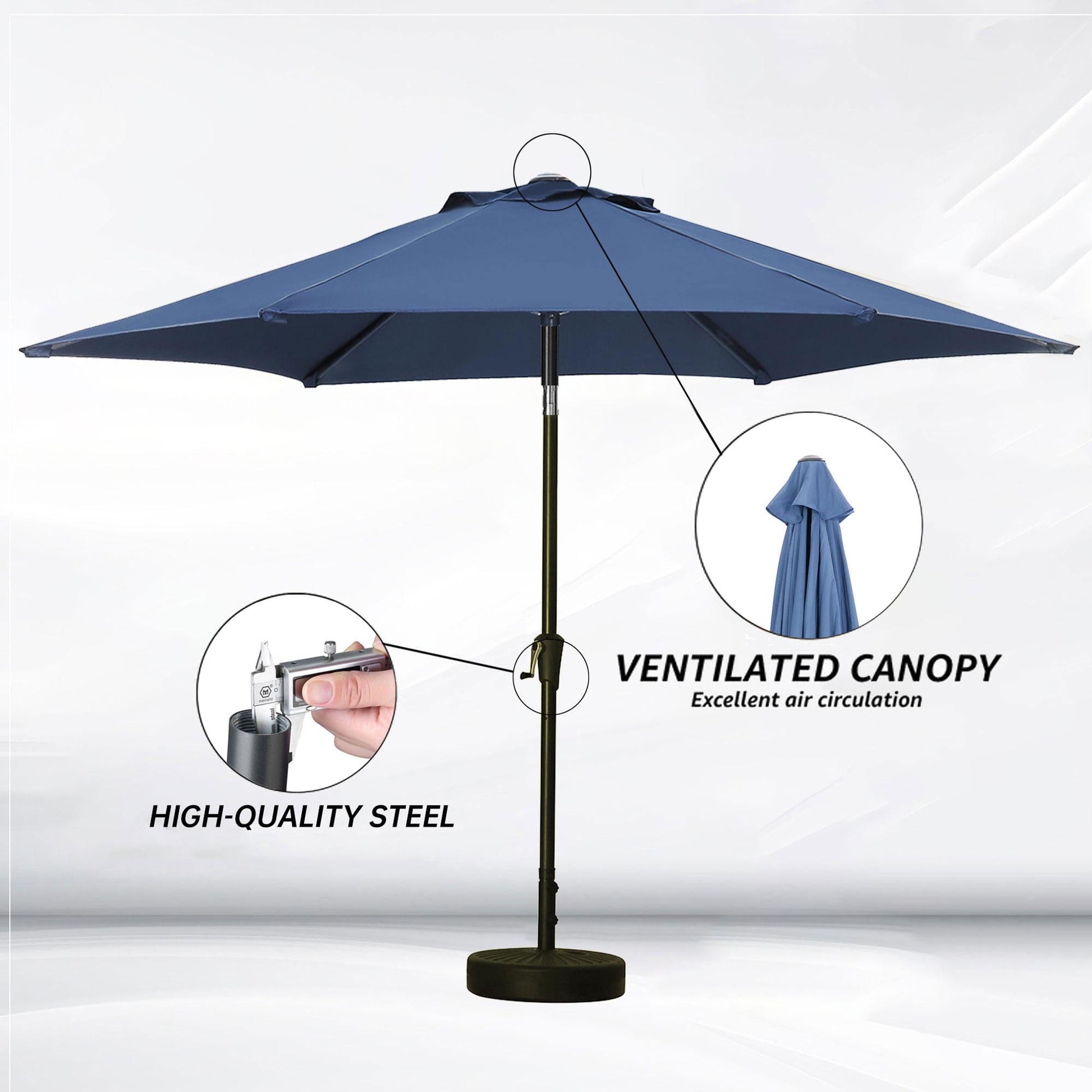The patio umbrella surface is made of polyester fabric that is waterproof, UV-resistant, and fade-resistant. The vented top design allows air to flow and prevent inversion.