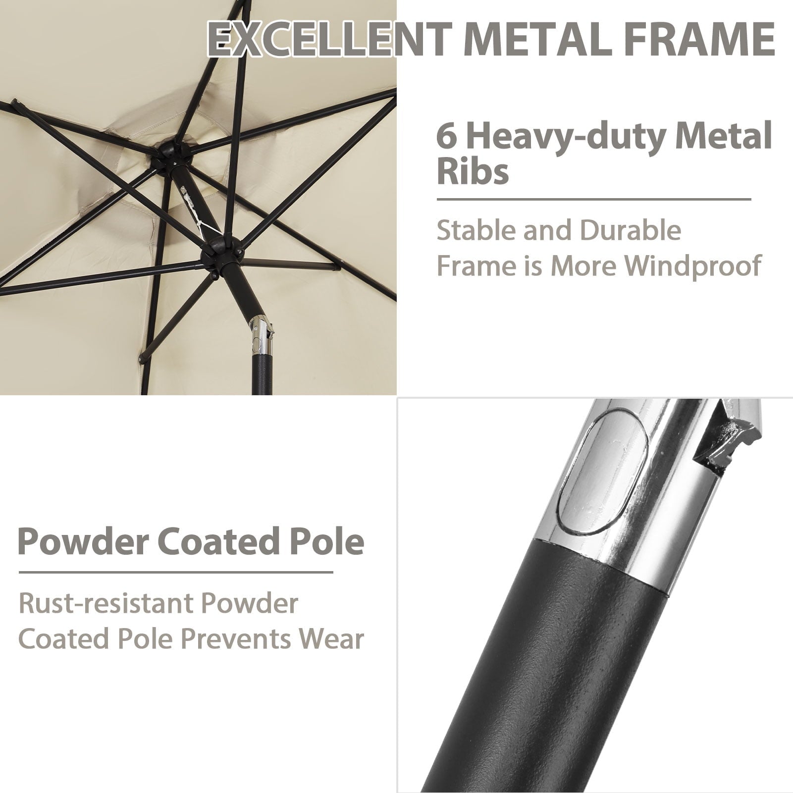 The market umbrella is equipped with 6 solid ribs that can withstand repeated use. The umbrella pole is made of powder-coated aluminum, it can against rust, corrosion, chipping, and peeling.