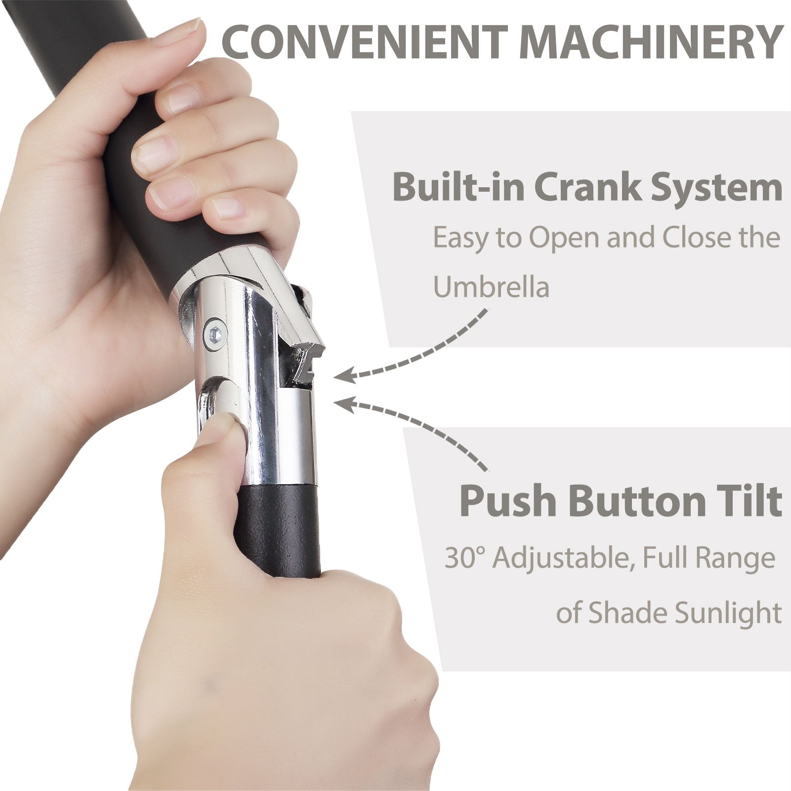 Crank lift design for easy opening and closing. The Tilt button can tilt the umbrella as the sun's position changes, you can enjoy the shade at any angle with this outdoor patio umbrella.